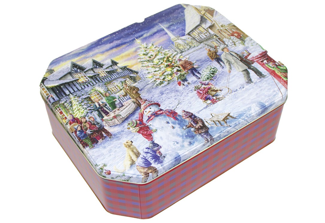 Gebäckdose Weihnachtsmarkt, Weißblech, achteckig, (LxBxH): 28,7x23,9x9,5 cm , lebensmittelecht.