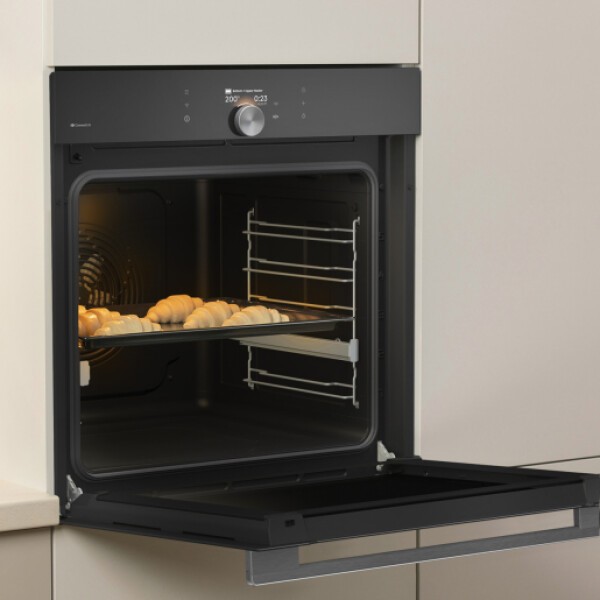 Der Multisystem-Backofen mit VisionPlus Display bietet ein Fassungsvermögen von 77 Litern und erreicht Temperaturen bis zu 300 °C. Ausgestattet mit zahlreichen Beheizungsarten wie Heißluft, AirFry+, TurboBake, GratinDuo und Pizza-Funktion, eignet sich das Gerät für vielseitige Anwendungen im professionellen Umfeld. Die Steuerung erfolgt über WLAN und integrierten Timer. Die Tür mit GentleClose-Mechanismus ist dreifach verglast und verfügt über ein dynamisches Kühlgebläse mit Nachlaufautomatik. Der Innenraum besteht aus EcoClean Email, ergänzt durch vollausziehbare Teleskopschienen, Fettpfanne, Backblech, Grillrost und Fleischsonde. Mit Energieeffizienzklasse A+, einem Anschlusswert von 3,5 kW und kompakten Einbaumaßen (595 x 595 x 564 mm).
