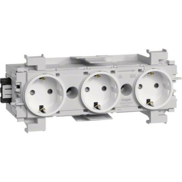 Steckdose 3-fach mit Wago Steck-/Klemmtechnik Frontrastend in verkehrsweiß. Kanalsteckdose mit erhöhtem Berührungsschutz, vorverdrahtet, anreihbar durch 3-poliges Steckverbindersystem mit Schnellbefestigung für frontrastender Geräteeinbau. Leitungsanschluss über Steckklemmen 1,5 - 2,5 mm² oder über verpolungssicheres Steckverbindersystem.