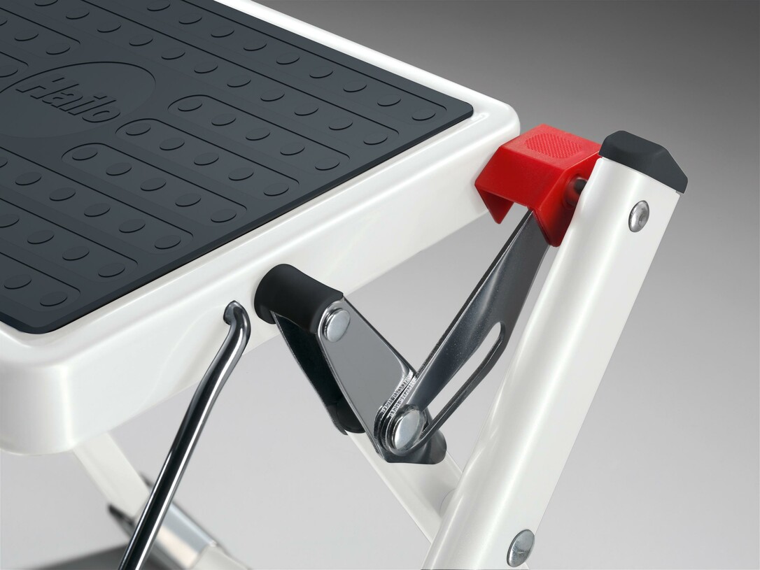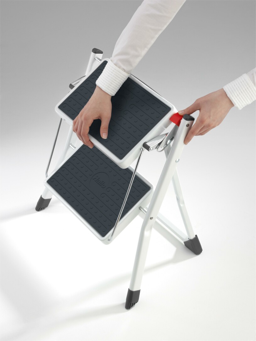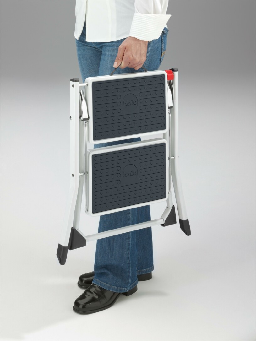| Artikeleigenschaften | Zusammengeklappt 4 cm schmal, Klappsicherung mit Entriegelungstaste, praktischer Tragegriff, 2 große Stufen mit Anti-Rutsch-Matten, rutschsichere Kunststoff-Füße, Belastbar bis 150 kg |
