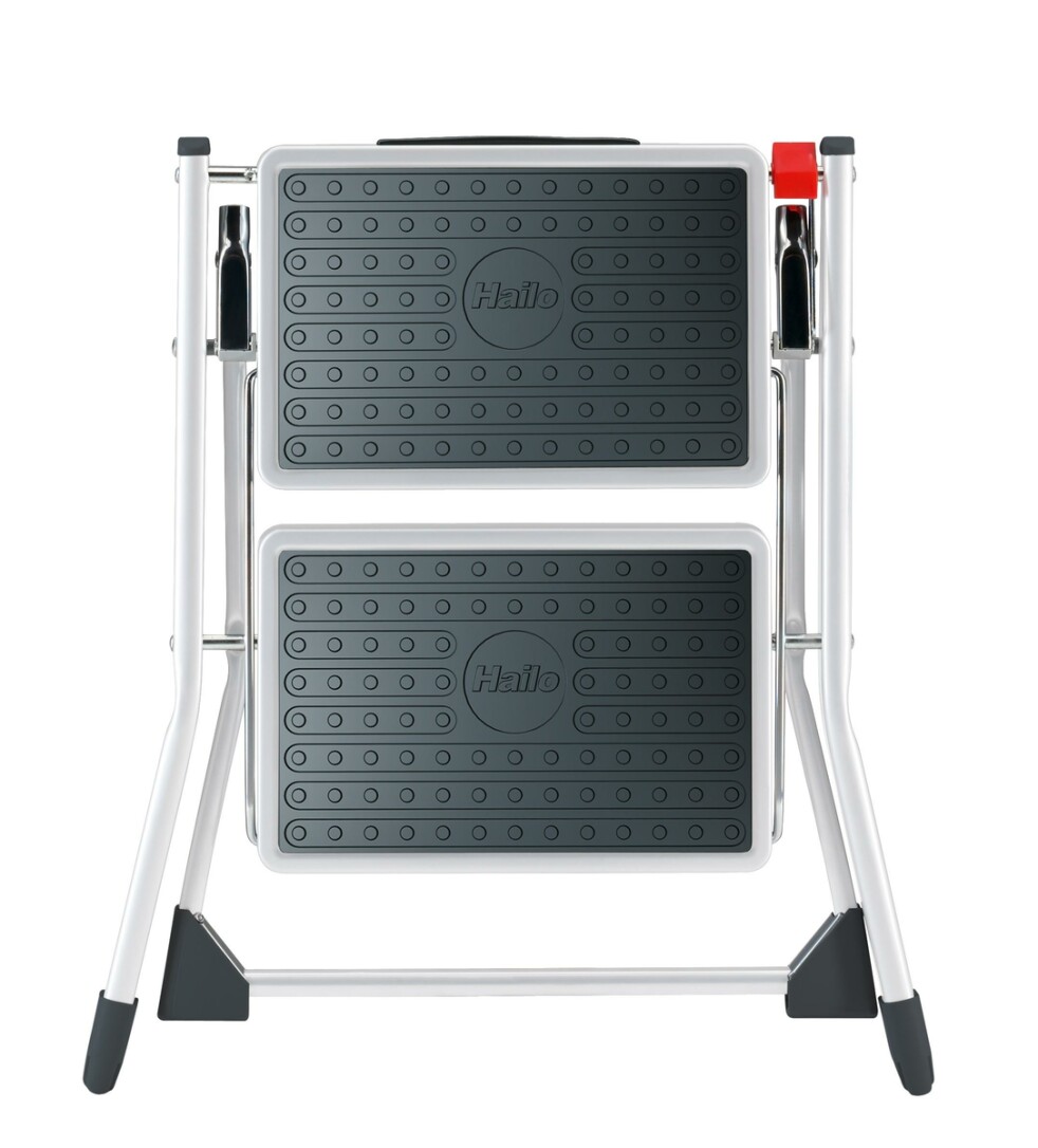 Der Stahl-Klapptritt "Mini" von Hailo besitzt 2 große Stufen mit Anti-Rutsch-Matten und rutschsichere Kunststoff-Füße, welche für einen sicheren Stand während der Benutzung sorgen. Eine Klappsicherung mit Entriegelungstaste verhindert ein ungewolltes Zusammenklappen des Trittes und durch den praktischen Tragegriff lässt er sich einfach tragen. Er ist bis 150 kg belastbar und zusammengeklappt nur 4 cm schmal und dadurch sehr platzsparend.