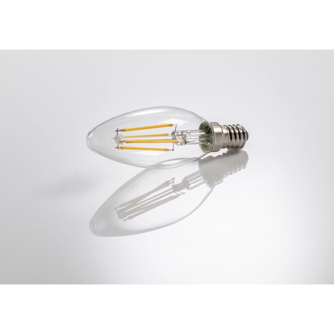 Die LED-Filamentlampe ist eine energieeffiziente Kerzenlampe mit einem E14-Sockel, die 470 Lumen bei nur 4 Watt Verbrauch liefert und eine herkömmliche 40-Watt-Glühlampe ersetzt. Sie zeichnet sich durch ihre dekorative Kerzenform und das klare Vollglasgehäuse aus. Die Lampe bietet eine angenehme warmweiße Lichtfarbe (2700 K) und ist ideal für allgemeine Beleuchtungsaufgaben in Innenräumen und Außenanlagen. Mit einer Lebensdauer von bis zu 15.000 Stunden und einem Farbwiedergabeindex von mindestens 80 sorgt sie für eine zuverlässige und langlebige Beleuchtung.