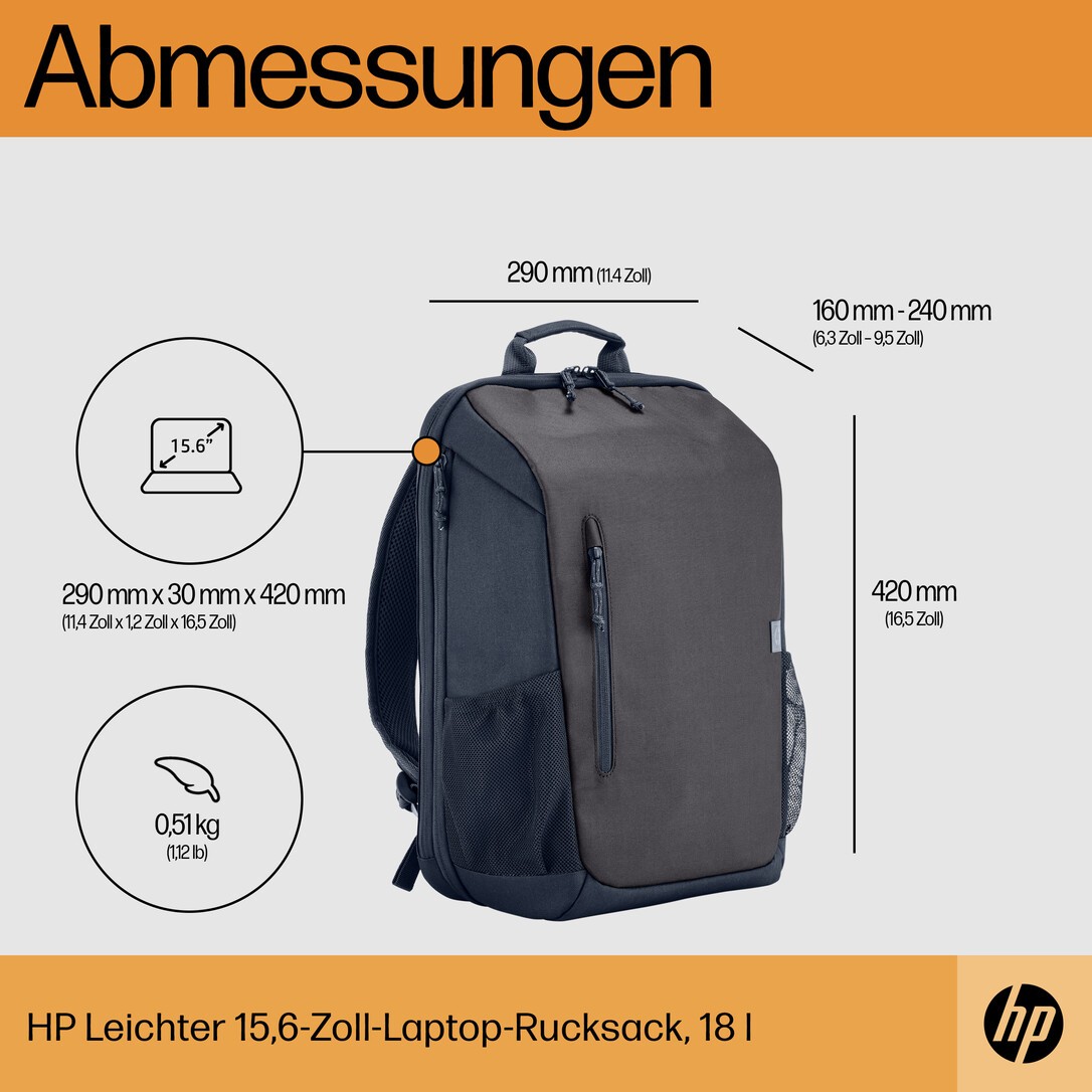 HP Reise-Laptop-Rucksack, 18 Liter, 39,6 cm (15,6 Zoll), Iron Grey. Etui-Typ: Rucksack, Maximale Bildschirmgröße: 39,6 cm (15.6"). Gewicht: 510 g