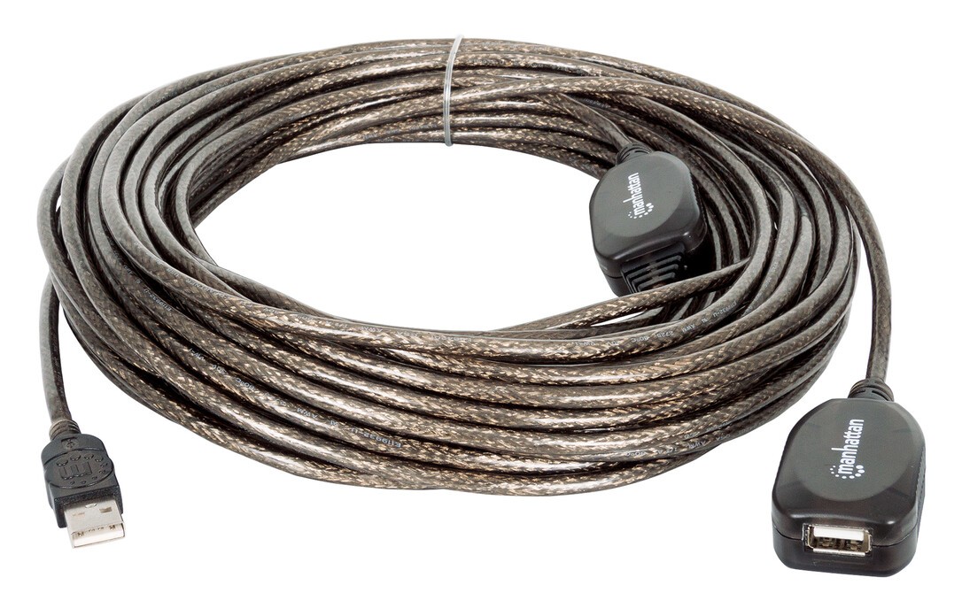 Use the Manhattan Hi-Speed USB Active Cable to connect a computer USB port to a USB device almost anywhere in the room. Daisy-chain 2 cable extensions to provide a convenient, 40m (131-ft.) connection. Manhattan Hi-Speed USB Active Cable with built-it repeater is fully-compliant with USB 1.1 and Hi-Speed USB specifications to help devices operate at maximum performance. Plug-and-play capability, Windows/Macintosh versatility and no external power or driver requirements help provide greater flexibility in computer and peripheral placement and office layout.