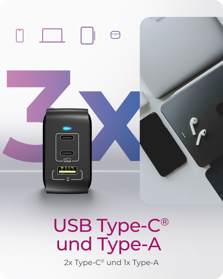ICY BOX IB-PS1030-PD, 3Port 65W GaN Ladegerät mit Power delivery, 2x USB Type-C®, 1x USB Type-A Anschluss, EU Stcker. Aufladetyp: Drinnen, Energiequelle: AC, Aufladekompatibilität: Universal. Eingangsspannung: 100 - 240 V, Maximale Ausgangsspannung: 20 V. Anzahl USB 2.0 Anschlüsse: 1, USB Typ-C Anzahl Anschlüsse: 2, Schnellladung, Energieschutzeigenschaften: Überspannung, Überhitzung, Kurzschluß. Produktfarbe: Schwarz