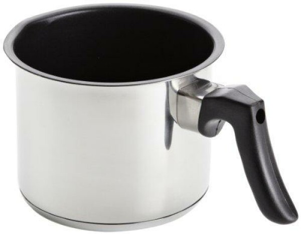 Milchtopf beschichtet aus rostfreiem Edelstahl, Durchmesser 12 cm, ca. 1,0 l, Kapselboden 4 mm, mit schwarzer Antihaft-Beschichtung, Kunststoffgriff und Ausguss. Ein Milchtopf, in dem nichts mehr festklebt oder anbrennt und Angebranntes mühsam weggeputzt werden muss. Ob Milch, Pudding, sahnehaltige Saucen, Süßspeisen, Milchreis und vieles mehr - nichts brennt an. Der Topf kann mühelos weiterverwendet und später gereinigt werden. Für alle gängigen Herdarten geeignet z.B. Gas, Elektro, Halogen, Kochfelder. Hinweis: einige Herdmodelle können die Induktionsfähigkeit der Töpfe erst ab einem Topfbodendurchmesser von 9 - 12 cm erkennen.