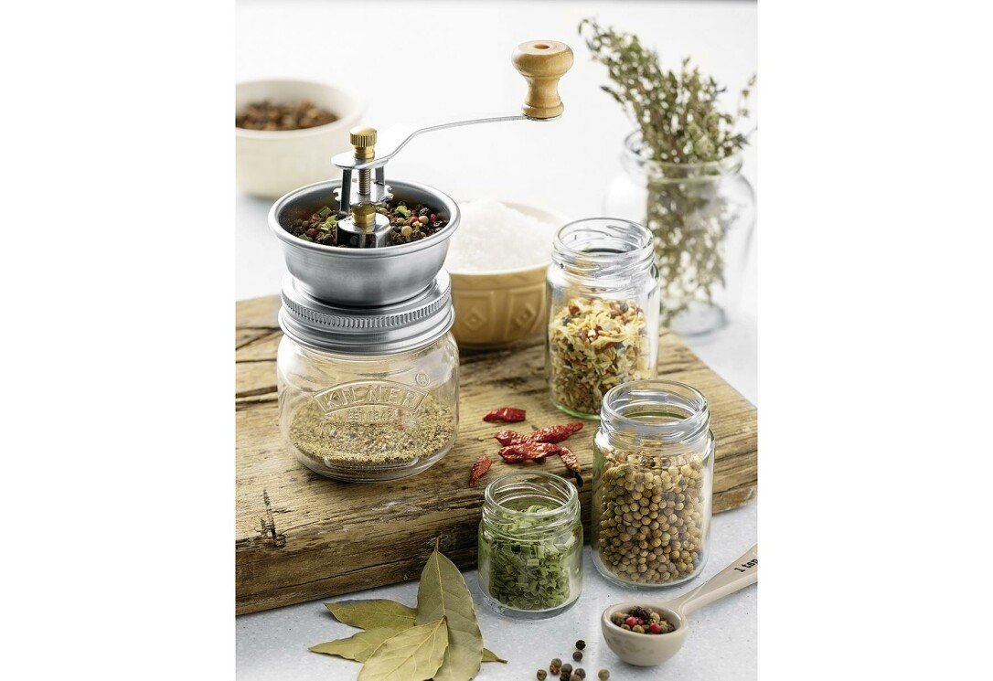 Das Kilner® Gewürzmühlen Set ist perfekte zum Mahlen und Aufbewahren von Gewürzen wie zum Beispiel Steinsalz, Pfefferkörner, getrocknete Kräuter und Samen. Kreieren Sie einzigartige und geschmackvolle Gewürzmischungen durch das Mahlen der Zutaten. Das handbetriebene Mahlwerk ist aus hochwertigem Edelstahl - und hochwertigen Keramikteilen gefertigt. Mit einer Stellschraube an der Oberseite, wird das Mahlwerk reguliert, für den gewünschten Mahlgrad. In dem 250-ml-Glasbehälter mit einteiligem Deckel bleibt die fertige Mischung länger frisch. Das Mahlwerk kann auch für die 0,5-Liter und 1-Liter-Kilner®-Einmachgläser verwendet werden. 250 ml, (LxBxH): 12,5x8,5x20 cm.