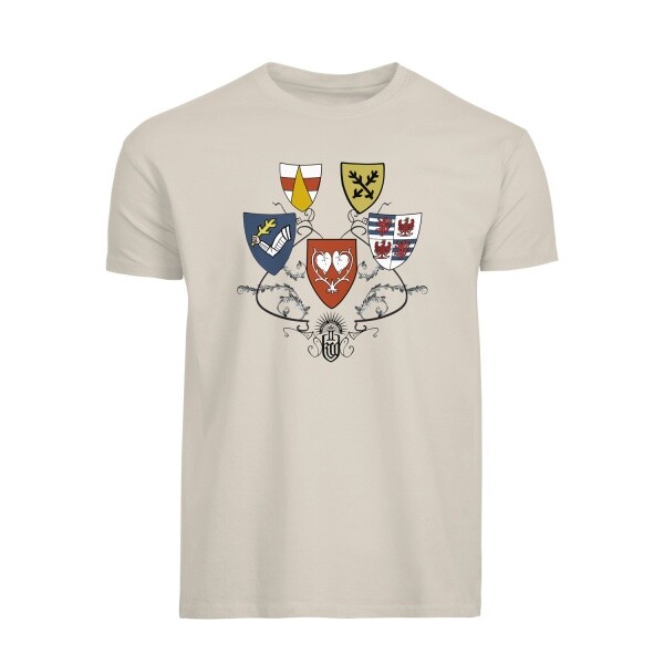 - Das naturfarbene T-Shirt in Größe S eine Anordnung der Wappen der Protagonisten im Spiel sowie einen Logo-Aufdruck auf der Rückseite