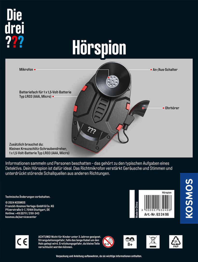 Wo findet die nächste Übergabe statt? Wird über den Tatort gesprochen? Mit dem Die drei ???-Hörspion wie echte Detektive an wichtige Informationen gelangen. Wie das geht, zeigt die detaillierte Anleitung. Vor dem ersten Lauschangriff einen Testlauf mit unterschiedlichen Geräuschquellen und Hindernissen durchführen. Das Richtmikrofon mit Kopfhörern verstärkt alle Geräusche und macht sie durch Türen und Wände hörbar. Durch die Kopfhörer bleibt die Beschattung lautlos. Mit vielen Tipps und Tricks von Justus, Peter und Bob für geheime Ermittlungen.