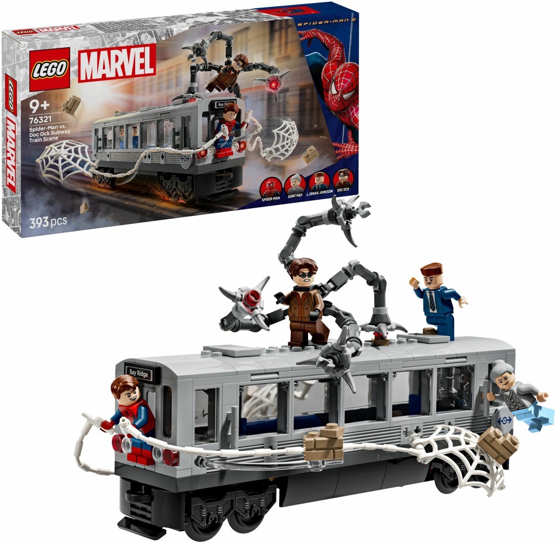Spider-Man vs. Doc Ock: Showdown in der U-Bahn (76321) ist ein actiongeladenes LEGO Marvel Bauset, das Kinder ab 9 Jahren in eine legendäre Filmszene aus Spider-Man 2 eintauchen lässt. Mit einem Modellzug und vier bekannten Minifiguren eröffnet dieses Set viele Möglichkeiten für kreative Abenteuer und spannende Duelle. Zum Set gehören LEGO Minifiguren von Spider-Man (mit austauschbaren Köpfen für maskiertes oder unmaskiertes Spiel), Doc Ock mit vier beweglichen Tentakeln und zwei Laserstrahlen, Aunt May und J. Jonah Jameson. Spider-Man kann sein Netz direkt am Zug befestigen, während Doc Ock die Tentakel an den Wagen anklippt, das sorgt für dynamische Spielszenen und reichlich Bewegung. Das Zugdach lässt sich abnehmen, sodass die LEGO Figuren leicht platziert werden können. Dieses Marvel Spielzeug ist ein Geschenk für Kinder ab 9 Jahre, die Superhelden, Züge und fantasievolles Rollenspiel lieben. Die Kombination aus Action, bekannten Charakteren und coolen Funktionen macht das Set zu einem Highlight für junge Marvel-Fans. Zusätzlichen Bau- und Spielspaß bietet die LEGO Builder App, mit der sich das Modell in 3D erkunden, drehen und der Fortschritt verfolgen lässt. Der Zug aus LEGO # Marvel Spider-Man vs. Doc Ock: Showdown in der U-Bahn ist 8 cm hoch, 23 cm lang und 5 cm breit Enthält 393 Teile.