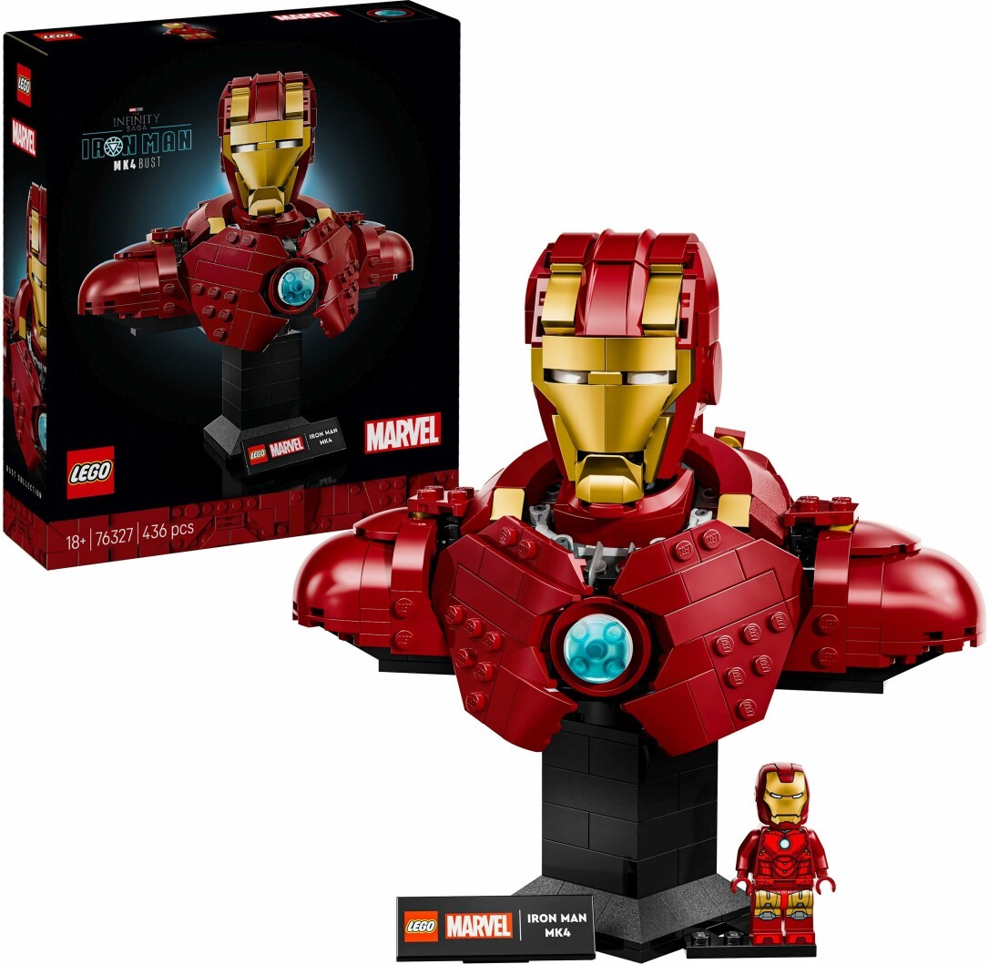 LEGO # Marvel Iron Man MK4 (76327) ist eine Hommage an einen der beliebtesten Charaktere aus dem Marvel Cinematic Universe. Die Büste aus diesem 436-teiligen Bauset für Erwachsene steht auf einem robusten Sockel. Das imposante Ausstellungsstück zum Sammeln wird erfahrenen Baumeistern und erwachsenen Fans von Marvel Filmen und Superhelden große Freude bereiten. Die baubare Superheldenbüste stellt die legendäre MK4 Rüstung dar, die Iron Man im Film Iron Man 3 aus den Marvel Studios getragen hat. Das baubare Modell hat zwei verstellbare Klappen auf dem Rücken, zwei einziehbare Kanonen in den Schultern und einen drehbaren Kopf. Auf dem robusten Sockel mit bedrucktem Namensschild steht die abnehmbare Minifigur Iron Man. Eine digitale Version der Bauanleitung zu diesem Set ist auch in der LEGO Builder App verfügbar, die dieses ebenso fesselnde wie anspruchsvolle Bauerlebnis wunderbar ergänzt. Eine tolle Geschenkidee für Erwachsene und Teenager, die Fans von LEGO Modellen und Marvel Superhelden sind. Die fertige Büste ist 17 cm hoch, 17 cm breit und 8 cm tief. Enthält 436 Teile.