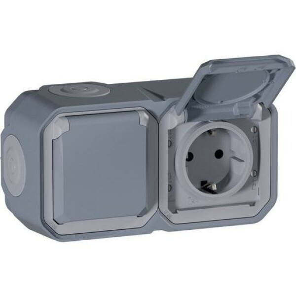 Wetterfestes Verkabelungszubehörsystem für Wohn- und Gewerberäume (Garagen, Keller, Parkplätze, Industriewerkstätten und Küchen) sowie Außenbereiche (Terrassen, Gärten, Campingplätze usw.). Vorverkabelte Steckdosen mit Anschlüssen.
