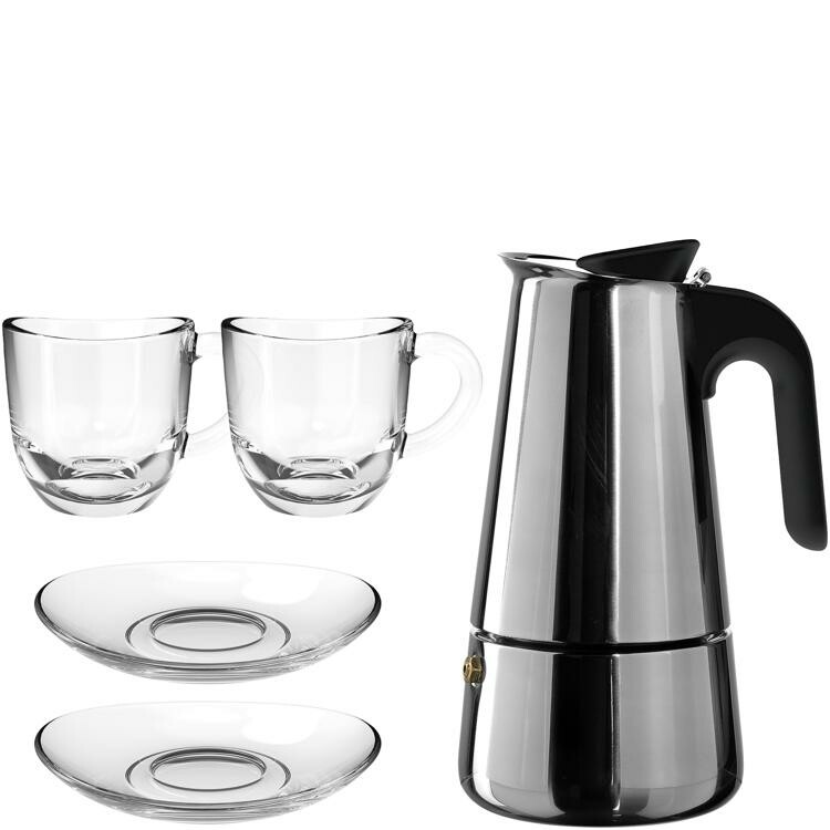 Glas / Edelstahl / Kunststoff, 1x Espressobereiter für 6 Tassen, 300 ml, induktionsgeeignet, 2x Espressotassen 80 ml, 2x Untertasse Ø 11 cm