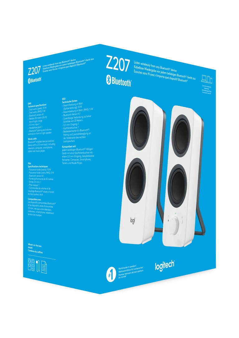 Logitech® Z207 has 10 Watts Peak/5 Watts RMS power that produces rich stereo sound at your desk. Each speaker has one active/powered driver that delivers full range audio and one passive radiator that provides bass extension. Listen via Bluetooth or a wired connection and seamlessly switch between them with the Logitech Easy-Switch™ feature. Easily access the Bluetooth pairing button, power, volume and the headphone jack on the front of the right speaker.