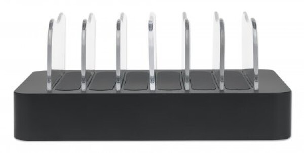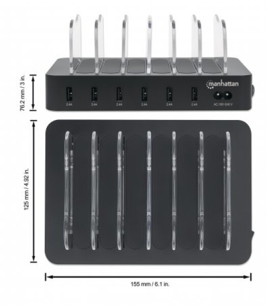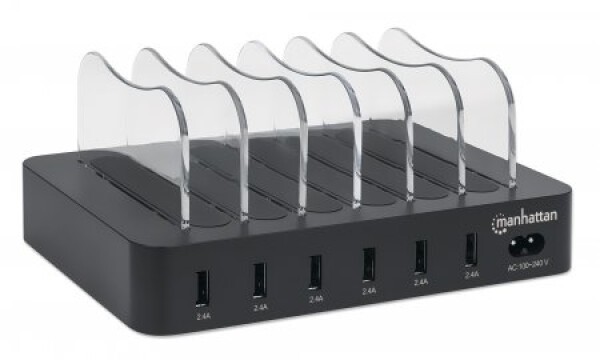 Manhattan Charging Station, 6x USB-A Ports, Outputs: 6x 2.4A, Smart IC, LED Indicator Lights, Black, Three Year Warranty, Box. Product colour: Black, Certification: CE FCC RoHS WEEE ETL. Input voltage: 100 - 240 V, Input current: 1 A. Width: 155 mm, Depth: 125 mm, Height: 76.2 mm. Cables included: AC. Quantity per pack: 1 pc(s)