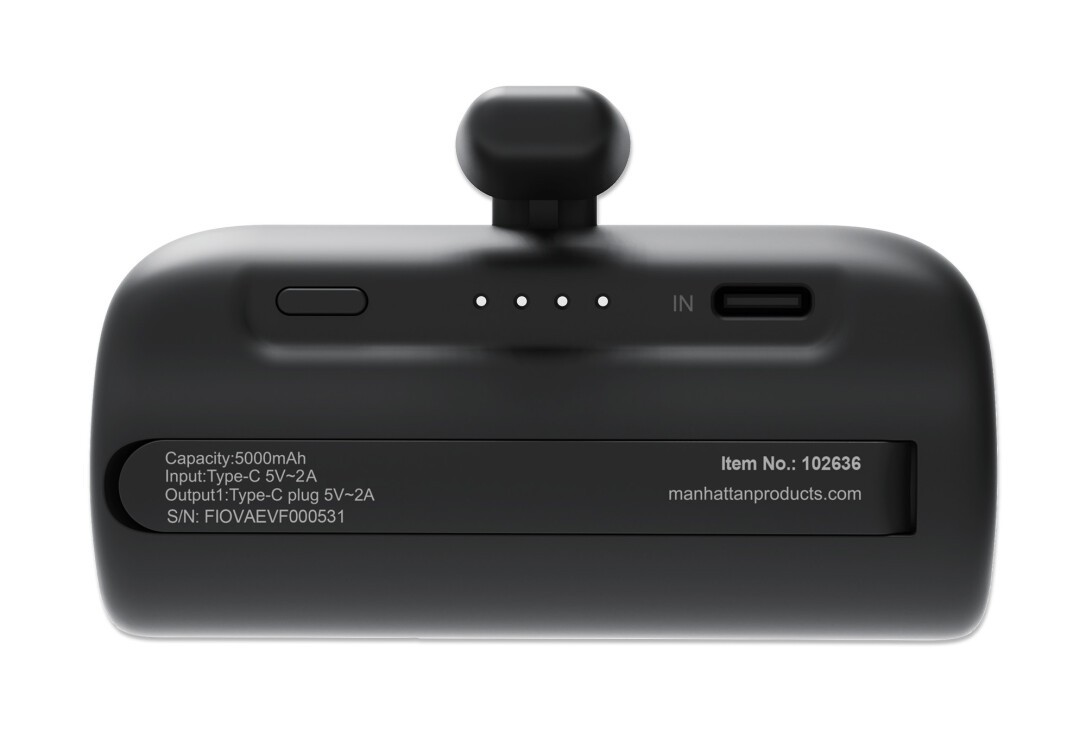 Manhattan 102636. Akku-/Batteriekapazität: 5000 mAh, Akku-/Batterietechnologie: Lithium-Ion (Li-Ion). USB Typ-C Anzahl Anschlüsse: 1. Gesamte Ausgangsleistung: 10 W, Ausgangsstrom: 2 A. Produktfarbe: Schwarz