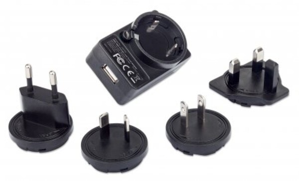 Manhattan USB-Ladegerät und Reiseadapter, Geeignet für Europa, UK, USA und Australien, ein USB-A-Ladeport lädt mit bis zu 1 A, schwarz, Drinnen, AC, 5 V, Schwarz