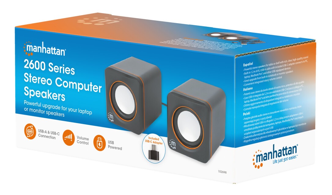 Manhattan 2600 Series. Empfohlene Nutzung: PC. Audio Kanäle: 2.0 Kanäle, Anzahl des Antriebs: 2. Übertragungstechnik: Kabelgebunden. RMS-Leistung: 6 W, Impedanz: 5 Ohm. Produktfarbe: Schwarz, Orange
