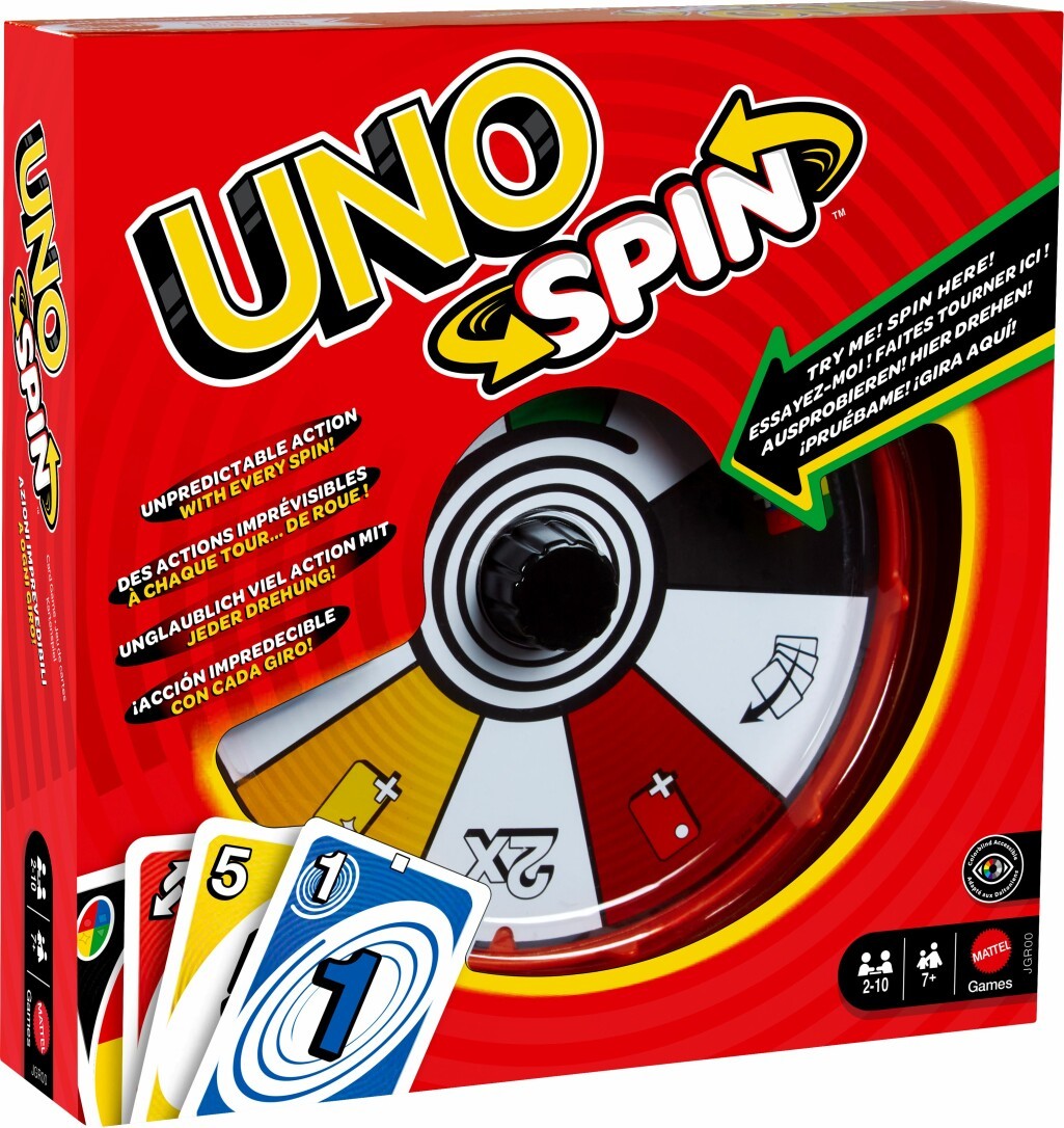 UNO Spin verleiht dem klassischen UNO einen neuen Dreh, der Spielspaß für alle bietet! Die Spieler legen der Reihe nach UNO-Karten nach Farbe, Zahl oder Aktion ab, um ihre Karten loszuwerden. Wird eine Dreh-Karte gespielt, muss der Spieler das Rad drehen und die Aktion befolgen. Unterschiedliche Drehaktionen wie Farbe ziehen, Handkarten tauschen, Farbe ablegen oder noch einmal drehen beeinflussen den Spielablauf vor allem, wenn jemand vergisst UNO! zu rufen. Enthält 112 Karten und 1 Drehscheibe. Abweichungen in Farbe und Gestaltung vorbehalten.