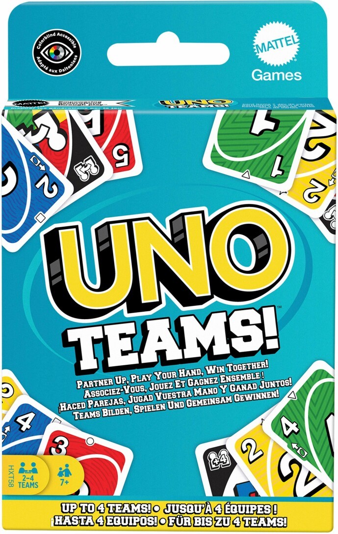 UNO Teams bietet eine neue Art, das klassische Spiel zu spielen. Spieler müssen immer noch passende Farben, Nummern und Symbole finden. Statt gegeneinander zu spielen, spielen sie in Zweierteams und versuchen, gemeinsam zu gewinnen. Sonderkarten und -regeln erleichtern den Teammitgliedern die Zusammenarbeit. Beide Spieler müssen jedoch alle Karten in ihren Händen ablegen, um zu gewinnen. Nicht vergessen: Wenn ein Spieler (oder sein Partner) nur noch eine Karte übrig hat, laut UNO rufen!