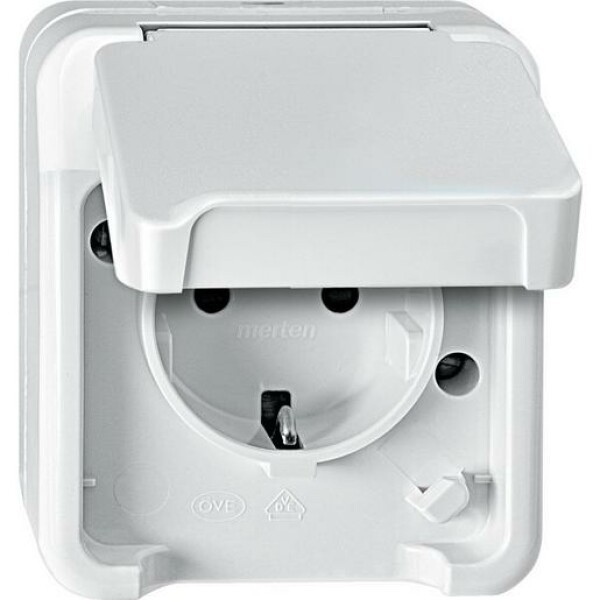 Merten MEG2300-8019. Socket type: CEE 7/3, Supported plug types: CEE 7/4. Product colour: White, Housing material: Thermoplastic, International Protection (IP) code: IP44. Width: 83 mm, Depth: 73 mm, Height: 57 mm