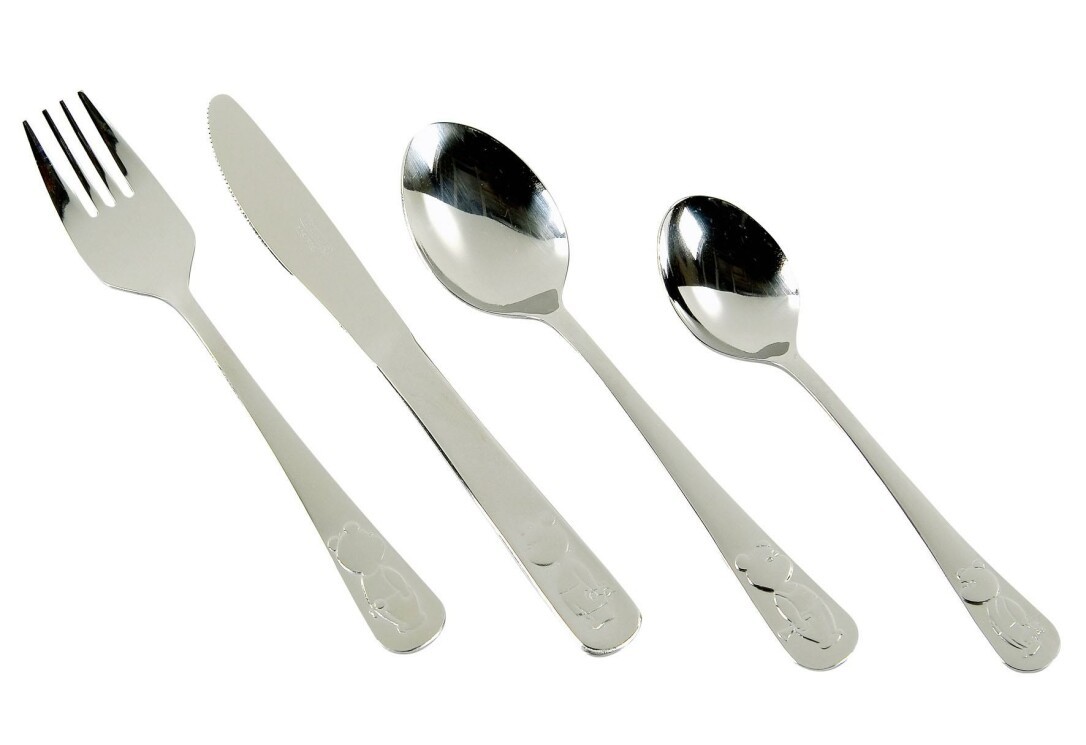 Edelstahl rostfrei, Länge der Besteckteile: Messer: 16,5 cm, Gabel: 15 cm, kleiner Löffel: 13 cm und großer Löffel: 14,5 cm