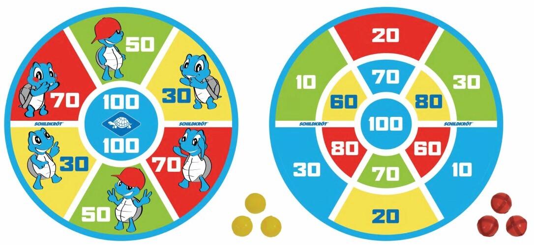 Soft Dart Set im neuen Design, bestehend aus Klett-Dart-Scheiben beidseitig mit unterschiedlichen Zielfeldern bedruckt (# 38cm), incl. 2x3 Klett-Bällen (# 4cm) für 2 Spieler. Im Karton. Der ungefährliche Dart-Spaß für die ganze Familie. Für Kinder ab 3 Jahren.