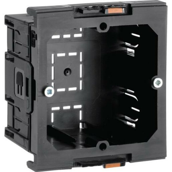 Geräteeinbaudose frontrastend Energie und Daten mit Standardgeräteeinbau schwarz. Geräteeinbaudose zur frontrastenden Befestigung für Standard-Geräteeinbau mit Rahmen des Schalterherstellers. Mit zwei Gerätehalteschrauben in Schnellgewindeausführung. Vertikaler und horizontaler Geräteeinbau, Fixieren und leichtes Umpositionieren der Geräteeinbaudose durch mechanische Verriegelung möglich.