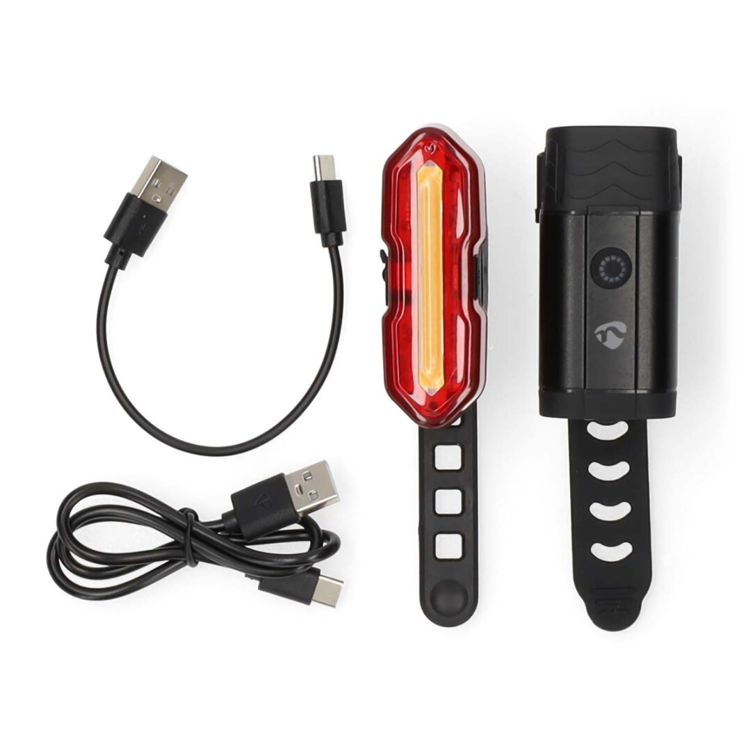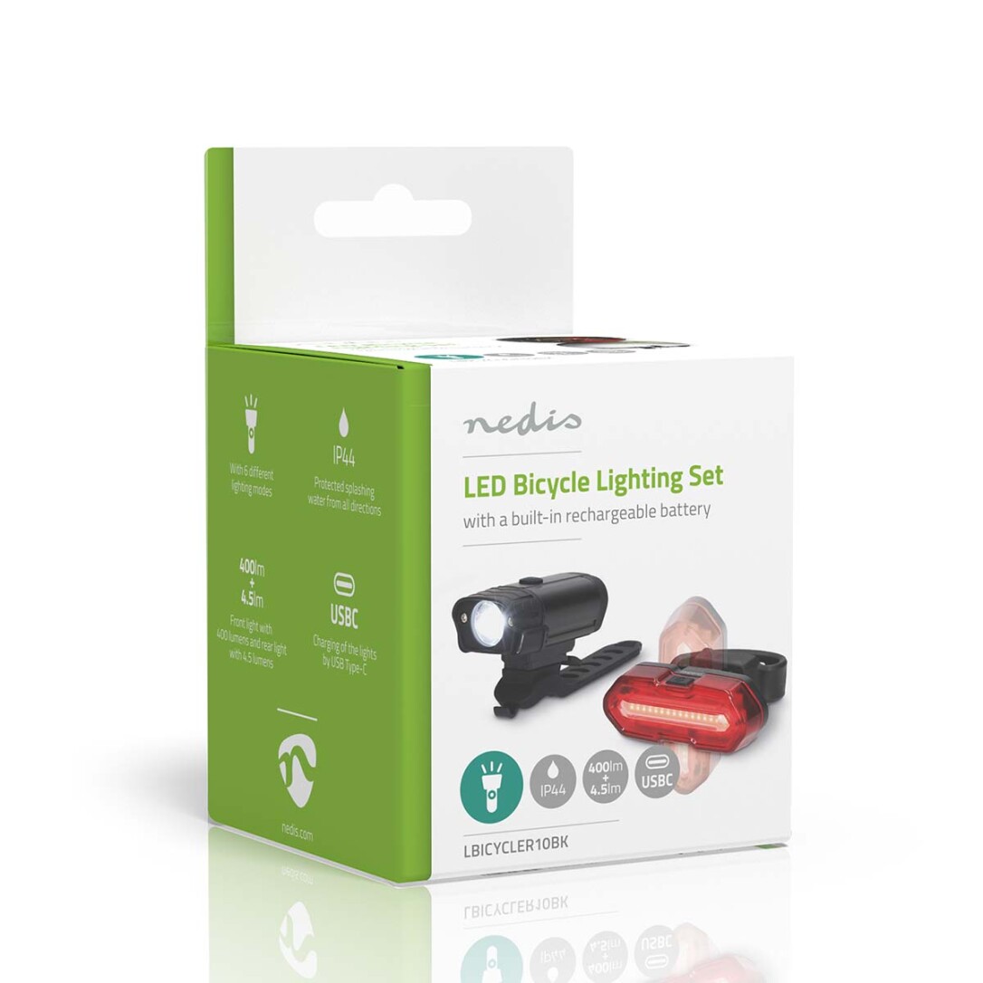Nedis USB Typ-C wiederaufladbares LED-Fahrradlicht-Set für sicheres Radfahren bei Tag und Nacht. Beleuchten Sie Ihren Weg mit Zuversicht mit unserem Frontlicht mit beeindruckenden 400 Lumen, das auch in den dunkelsten Nächten Sichtbarkeit gewährleistet. Das Rücklicht, das mit 4.5 Lumen leuchtet, verbessert Ihre Sichtbarkeit für andere Verkehrsteilnehmer und erhöht so Ihre Sicherheit.Mit sechs vielseitigen Beleuchtungsmodi, darunter volle Helligkeit, halbe Helligkeit, schnelles Blinken und langsames Blinken, können Sie sich nahtlos an jede Umgebung anpassen. Genießen Sie eine problemlose Installation dank der benutzerfreundlichen Gummibänder, mit denen die Lichter ohne Werkzeug sicher an Ihrem Fahrrad befestigt werden können.Mit einer Laufzeit von 2 bis 20 Stunden, je nach gewähltem Modus, begleiten Sie diese Lichter auf ausgedehnten Fahrten. Dank der Schutzart IPX3 können Sie auch bei leichtem Regen sicher Rad fahren, da die Leuchten vor Spritzern aus allen Richtungen geschützt sind.Verbessern Sie Ihr Fahrraderlebnis mit dem wiederaufladbaren USB-Typ-C-LED-Fahrradlichtset von Nedis – die perfekte Mischung aus Helligkeit, Komfort und Haltbarkeit für jede Fahrt• Ohne Deutsches Prüfzeichen: Verkauf und Verwendung im Anwendungsbereich der StVZO (DE) ist nicht erlaubt. Nur an nicht-deutsche Kunden verkauft.