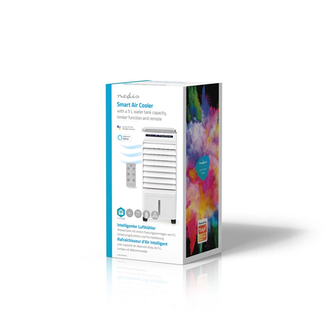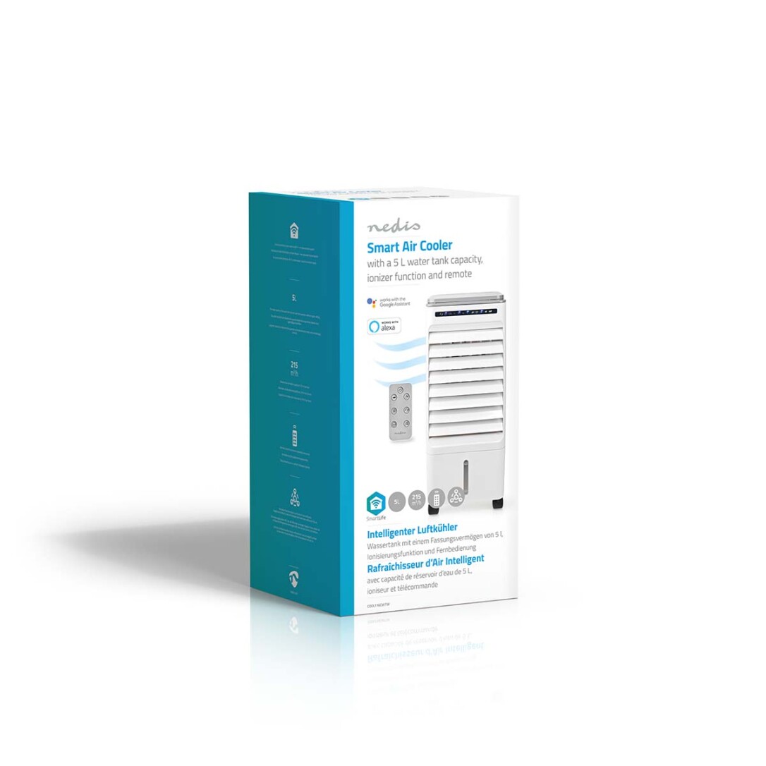 Wenn Sie einen kraftvolleren und effizienteren Luftstrom benötigen als den, den ein gewöhnlicher Ventilator erzeugt, und wenn Sie kein Fenster öffnen können oder einfach keine Löcher für einen Klimaanlagen-Abluftschlauch bohren möchten, bietet dieser Luftkühler von Nedis SmartLife die perfekte Lösung.Schließen Sie den intelligenten Luftkühler an Ihr WLAN-Netzwerk an und laden Sie die Nedis SmartLife-App herunter. Sie können den Luftkühler ganz einfach aus der Ferne mit der App steuern oder die Sprachaktivierung mit Google Assistant oder Amazon Alexa nutzen. Der Luftkühler ist zudem standardmäßig mit einer Fernbedienung ausgestattet. So müssen Sie also zum Temperaturregeln keinen unnötigen Schritt mehr machen. Sie haben längere Zeit keine WLAN-Verbindung? Keine Sorge, denn Sie haben immer die Möglichkeit, den Luftkühler über ihr Bedienfeld zu steuern.Der Luftkühler funktioniert wie folgt: Er zieht trockene, heiße Luft ein, die durch ein angefeuchtetes Pad geleitet wird, dieses Pad absorbiert die Wärme, die Feuchtigkeit im Pad verdunstet, die Luft wird um ein paar Grad abgekühlt und Sie können eine belebende, erfrischende Brise genießen. Vergleichen Sie dies mit einem heißen Sommertag, den Sie auf dem Wasser verbringen: Trotz der hohen Temperaturen fühlt es sich immer noch angenehm kühl an.Die befeuchtete Luft wird in den Raum zurückgeblasen, sodass Sie nicht der trockenen Luft ausgesetzt sind, die von Klimaanlagen ausgeht.Durch die Ionisierungsfunktion wird der Staub in der Umgebung verringert und Gerüche im Raum werden beseitigt.Sehr einfaches Befüllen des Wassertanks über die Oberseite.Mit vier Eispacks, um die Kühlleistung weiter zu verbessern.
