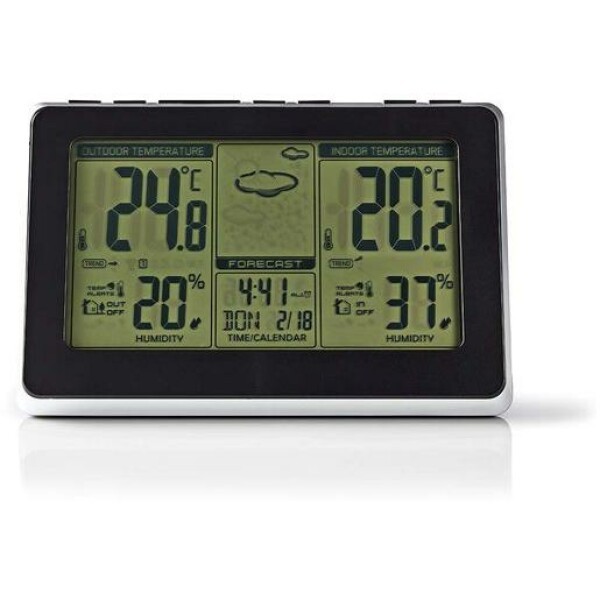 This versatile Nedis® Wireless Weather Station provides information about the indoor and outdoor temperature, as well as reporting on expected weather conditions. What’s more it also doubles as an alarm clock so, come rain or shine, you’ll always be up and out of bed on time!The outdoor sensor can be sited anywhere within your garden. It operates by 2x AA batteries (not included) to transmit six levels of weather data to the alarm clock/weather station inside via a 433 MHz frequency signal.Sleek and stylish display unitThe sleek and stylish display unit can be placed anywhere in your home as it does not require a mains supply, operating with 3x AAA batteries (not included). Alarm clock and weather information/forecastingIt offers time and date information, an alarm clock with snooze function and six levels of information about the current and predicted weather including humidity, outdoor temperature, indoor temperature and comfort level.Can be controlled remotelyThe unit can be controlled remotely with an additional radio controller (not included) and its black and silver casing houses an easy to read display that is enhanced by a stylish blue backlight.