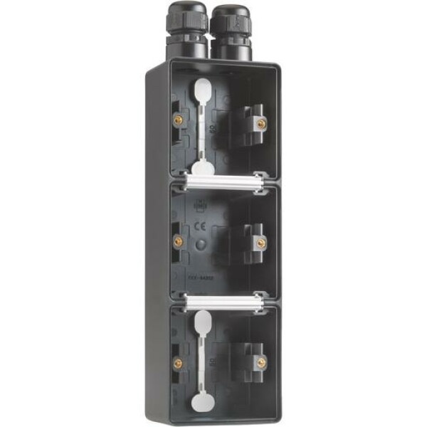 Diese vertikale 3-fach-Aufputzdose mit zwei M20-Einführungen eignet sich für 3 Funktionen. Die gesamte Einheit ist spritzwassergeschützt und deshalb besonders geeignet für die Verwendung in feuchten Räumen und anspruchsvollen Umgebungen. Farbausführung: black.