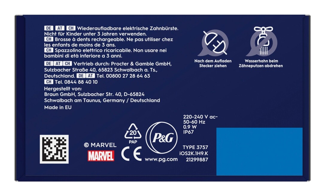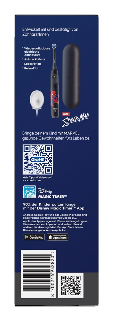 Oral-B iO Kids 6+ Spiderman Elektrische Zahnbürste inkl. 1 Aufsteckbürste, 1 Reise-Etui. Zweck: Kind, Zahnbürstentyp: Rotierende Zahnbürste, Zahnbürsten Modi: Tägliche Pflege, Sensibel, Super sensitive. Energiequelle: Akku, Akku-/Batterietyp: Integrierte Batterie, Stromverbrauch (Standardbetrieb): 0,9 W. Verpackungsart: Box. Anzahl enthaltener Griffe: 1 Stück(e), Anzahl enthaltener Bürstenköpfe: 1 Stück(e)