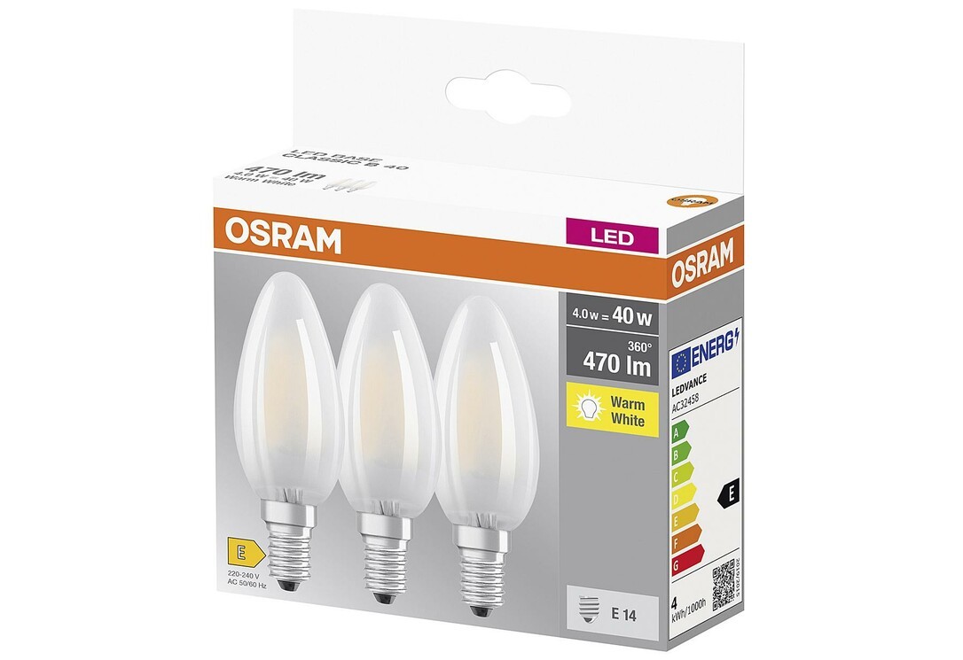 Osram Classic. Bulb power: 4 W, Fitting/cap type: E14, Luminous flux: 470 lm, Bulb lifetime: 15000 h, Light colour: Warm white, Colour temperature: 2700 K, Color Rendering Index (CRI): 80, Power factor: 0.4