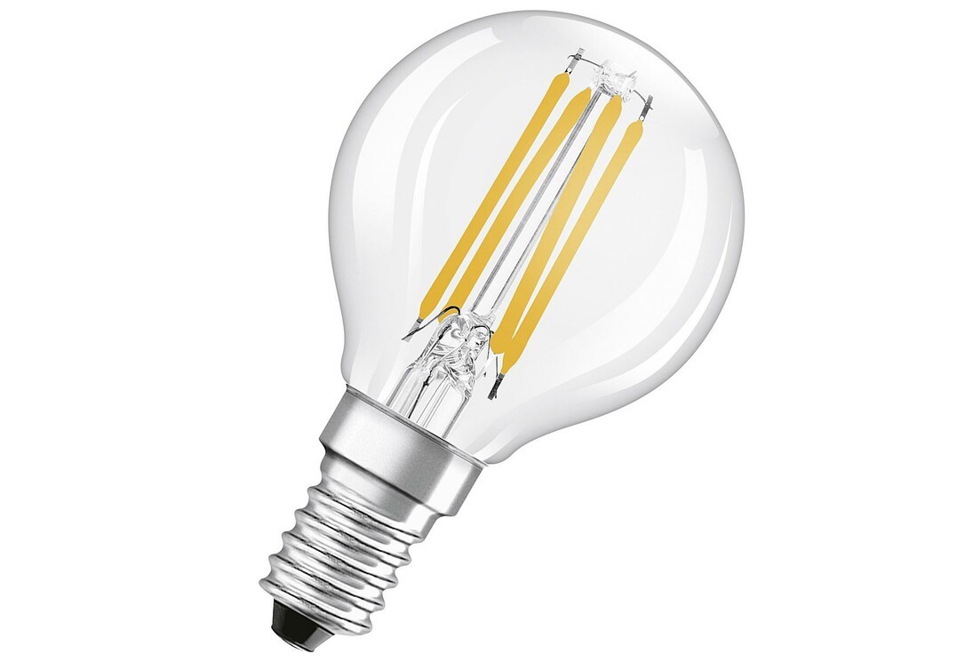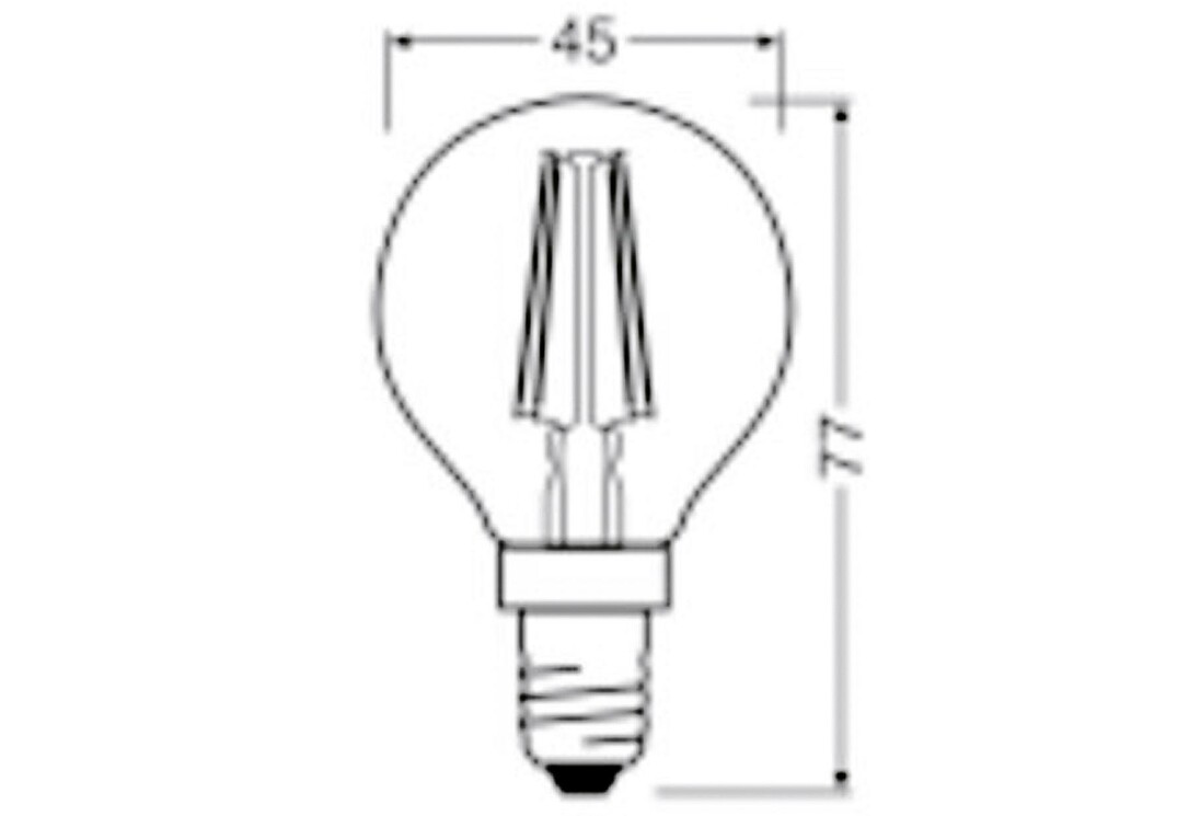 LED-LAMPEN, klassische Miniballform, ENERGIEEFIZIENTKLASSE B. Produkteigenschaften: LED-Lampen für Netzspannung. Ausstrahlungswinkel: bis zu 300°. Sehr lange mittlere Lebensdauer: 50.000 h . Sehr hohe Anzahl von Schaltzyklen: 500.000. Sehr hohe Effizienz von bis zu 188 lm/W. Produktvorteile: Lampen mit innovativer LED-"Filament"-Technologie. Design, Abmessungen, Lichtstrom vergleichbar mit einer Halogenlampe. Sehr geringer Energieverbrauch. Sofort 100 % Licht, keine Aufwärmzeit. Anwendungsgebiete: Ideal für dekorative Einbauten. Anwendungen im Haushalt. Allgemeinbeleuchtung. Einsatz im Außenbereich nur in Außenleuchten (mindestens IP65).