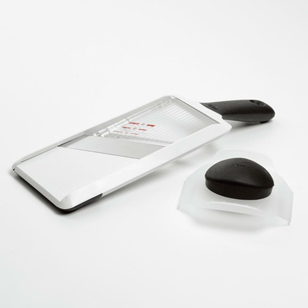Edelstahl / Kunststoff, Scheibendicke mit dem weichen Knopf einstellbar, Edelstahlklinge, transparente Oberfläche, Schnittguthalter schützt die Hände und dient als Klingenabdeckung bei Nichtbenutzung