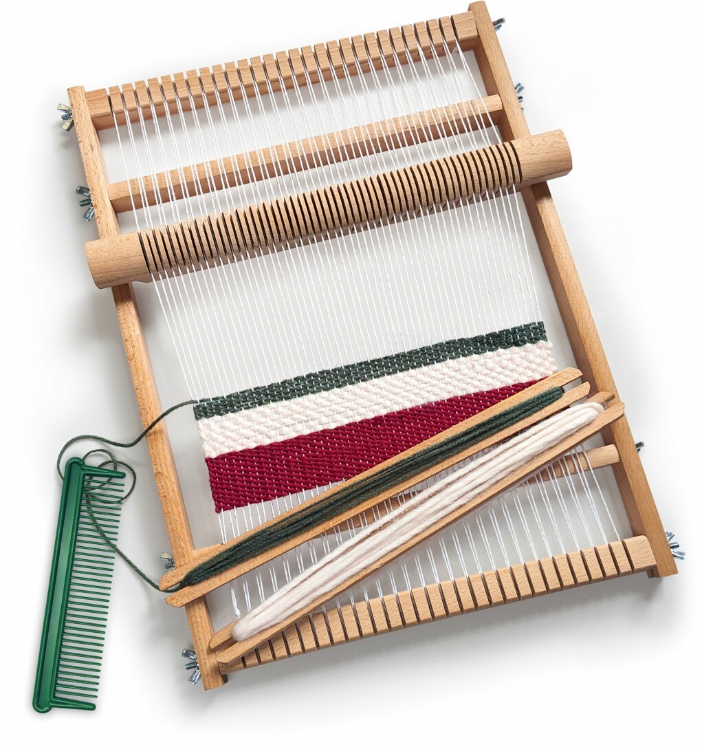 Webrahmen aus Buchenholz im Beutel, 25 mm Durchmesser, mit 2 Schiffchen und 1 Kamm, unmontiert mit Flügelschrauben.