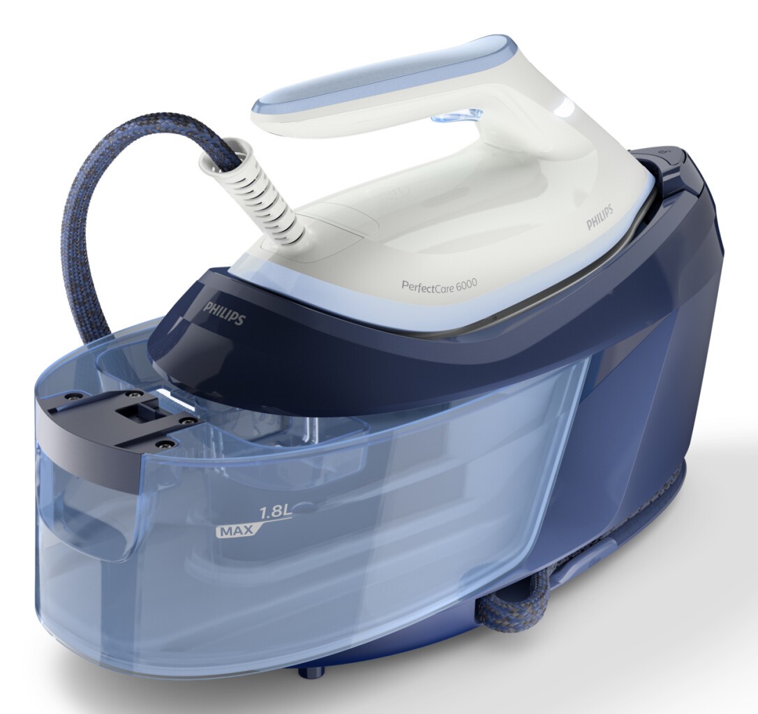 Philips 6000 series PerfectCare PSG6026/20 Dampfbügelstation. Bügeleisen-Wattleistung: 2400 W, Dampfstoßleistung: 500 g/min, Material Bügelsohle: SteamGlide Plus-Sohle. Energieeinsparung: 30%. Kabellänge: 1,65 m, Schlauchlänge: 1,6 m, Schnur-Befestigungssystem: Velcro fix. Breite: 168 mm, Tiefe: 368 mm, Höhe: 269 mm. Max. Leistung: 2400 W, Garantiezeit: 2 Jahr(e), Ursprungsland: Vereinigtes Königreich