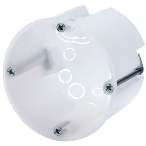 Hohlwand Gerätedoseverbindungsdose, halogenfrei, flammidrig, Ausführung mit Metallkralle, mit vermontierten Geräteschrauben, Ausbrechöffnungen für Rohre und Leitungen, Geräteschraubenabstand 60 mm, Schutzart IP30, VDE geprüft, Bohrloch Ø 68 mm, weiß, Tiefe 61 mm.