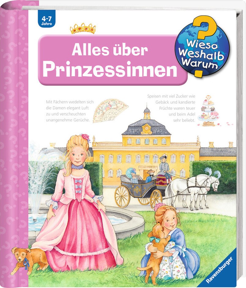 Wie schön wäre es, einmal Prinzessin zu sein! Doch wie sah der Alltag auf dem Schloss wirklich aus? Mussten Prinzessinnen zur Schule gehen? Welche Frisuren und Schmuckstücke trugen sie zum Ball? Warum brauchten sie eine Flohfalle? Dieser Band lädt zu einem schillernden Ausflug in das pompöse Leben bei Hofe ein. Dabei entdecken Kinder spannendes Sachwissen über Prinzessinnen in der Zeit des Barock. Mit herausnehmbarer Prinzessinnen-Anziehpuppe.Wieso? Weshalb? Warum?Die Sachbuchreihe für Kinder von 47 JahrenJeden Tag entdecken Kinder etwas Neues da kommen viele Fragen auf. Warum sind die Dinosaurier ausgestorben? Wo ist die Sonne in der Nacht? Wozu brauchen wir das Blut? Die beliebte Sachbuchreihe Wieso? Weshalb? Warum? gibt Kindern Antworten auf Augenhöhe. Dabei werden die unterschiedlichsten Themen aus der Alltags- und Interessenswelt der Kinder altersgerecht und mit viel Liebe zum Detail unter die Lupe genommen.Detailreiche Bilder, verständliche Sachtexte und überraschende Klappen, die Bewegungen oder Abläufe veranschaulichen und hinter die Dinge blicken lassen, ermöglichen Kindern, sich ihre Themen selbst zu erschließen. Der Spaß am eigenhändigen Entdecken, die liebevolle Umsetzung und die qualitativ hochwertige Ausstattung garantieren langanhaltende Freude an jedem einzelnen Buch.