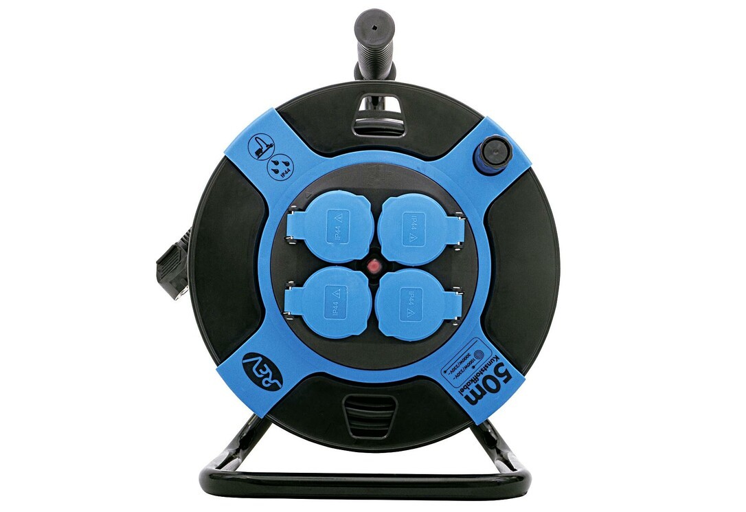 Trommelscheiben aus schlagfestem Kunststoff, 4 spritzwassergeschützte Schutzkontaktsteckdosen, VDE, ÖVE, Gummi-Schutzkontaktstecker, Thermoschalter als Überhitzungsschutz mit integrierter Wiederanlaufsperre, mit erhöhtem Berührungsschutz, Ständer aus lackiertem Stahlrohr, federnde Lagerung des Trommelkörpers, zur vorübergehenden Verwendung im Freien, IP 44, Feststellbremse, verschiebbar, Kabelclip zur Leitungsfixierung, REV-Qualitätsleitung H05VV-F 3G1,5 - VDE-HAR, 50 m PVC Kabel, drehbarer Wickelgriff und komfortabler Tragegriff, technische Daten: 230 V ~, max. 3000 Watt.