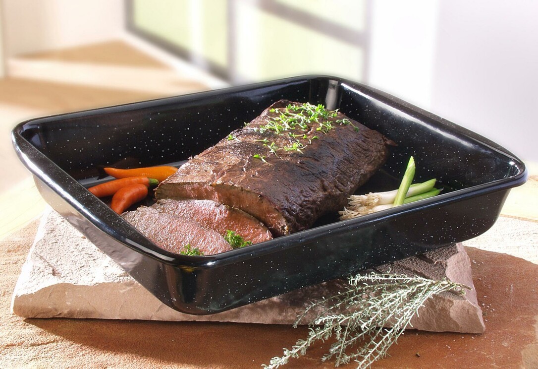 Die schöne Brat- und Backform aus Emaille besitzt eine extra große schnitt- und kratzfeste Oberfläche. Sie hat eine optimale Wärmeleitung und dementsprechend ein tolles Bratergebnis. Für alle Herdarten geeignet, auch für Induktion, für Nickelallergiker empfohlen. (LxBxH): 32x19x5,5 cm