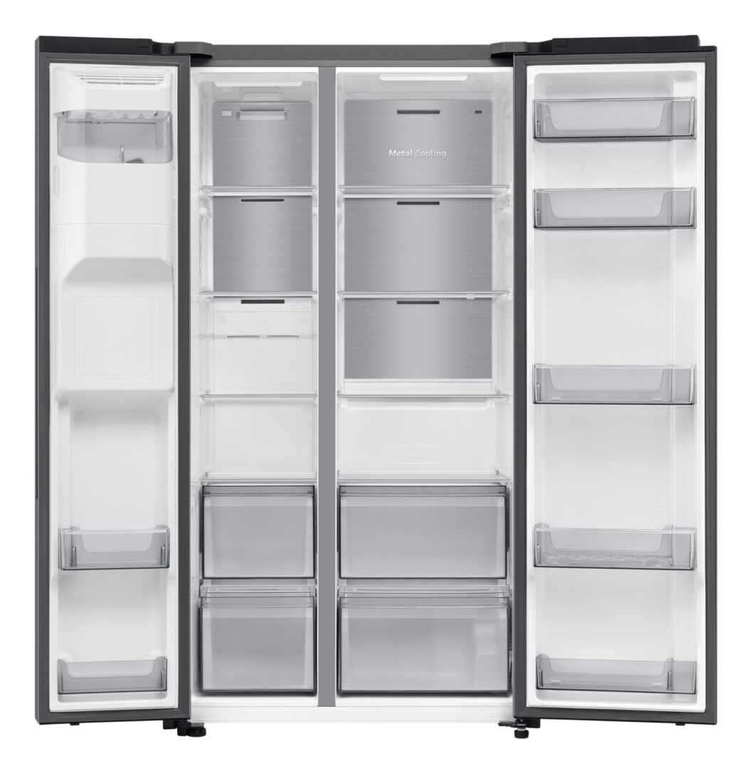Samsung RS70F64KET. Geräteplatzierung: Freistehend, Produktdesign: Amerikanische Tür, Produktfarbe: Edelstahl. Nutzinhalt Gesamteinheit: 640 l, Klimaklasse: ST, Lärmemissionsklasse: C. Nutzinhalt Kühlschrank: 420 l, Lampentyp: LED. Nutzinhalt Gefrierfach: 220 l, Gefrierfachposition: Seitlich platziert, Gefrierkapazität: 13 kg/24h. Bedienung durch Apps unterstützt: SmartThings