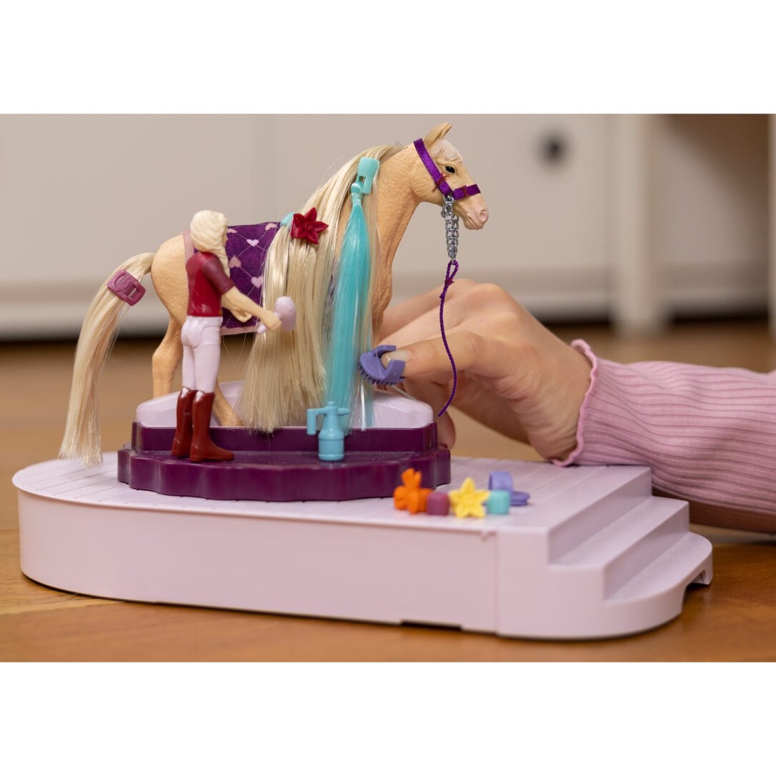 The wellness session in the horse grooming station is going so well, the horse doesn’t want to leave. The beauty horse is really enjoying all the brushing and sponging. To help the mane and tail dry faster, there’s a hairdryer waiting in the drawer. Now the styling can begin. You can add beads, bows or flowers and there’s even an extra strand of hair. To make sure everyone knows you belong together, the horse and rider have a matching look: the horse blanket and vest have the same pattern and even the gaiters match the armband.