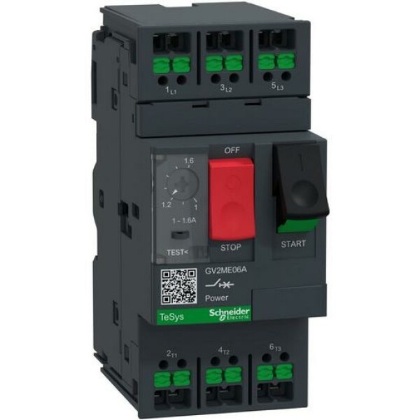 TeSys Power Motorschutzschalter. Motorschutzschalter, 3P. Bemessungsleistung 0,37 kW, Einstellbereich 1-1,6 A. Mit thermischen und magnetischen Auslösern. In der Grundausführung plombierbar und abschließbar. Betätigung über Taster. Bemessungsspannung 400 V, nach AC-3. Schnelle, sichere und wartungsfreie Stromverbindung mit SnapIN Anschlussklemme. Geeignet für Sicherheitsanwendungen durch mechanisch gekoppelte Kontakte und Spiegelkontakte.