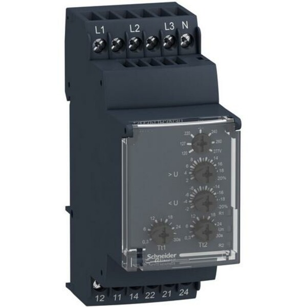 Spannungswächter, Über-/Unterspannung Phase-Phase-Neutral, 114..329 V AC. Produktbereich: Zelio Control - Produkt oder Komponententyp: modulare Mess- und Steuerrelais - Relaistyp: Spannungsüberwachungsrelais - produktspezifische Anwendung: für 3-Phasen-Einspeisung - Bezeichnung des Relais: RM35UB3 - relaisüberwachte Parameter: nicht neutral, Überspannung und Unterspannung zwischen neutral, Überspannung und Unterspannung zwischen Phasen - Schaltleistung in VA: 1250 VA - Nutzungskategorie: AC-12 gemäß IEC 60947-5-1, AC-13 gemäß IEC 60947-5-1, AC-14 gemäß IEC 60947-5-1, AC-15 gemäß IEC 60947-5-1, DC-12 gemäß IEC 60947-5-1, DC-13 gemäß IEC 60947-5-1, DC-14 gemäß IEC 60947-5-1. Ihr Nutzen: Mess- und Überwachungsrelais. Einfache und dabei genaue Anpassungsmöglichkeiten sorgen für eine schnelle und leicht zu handhabende Einrichtung. Die Relais decken alle Anforderungen für die Überwachung der mobilen Prozesssteuerung und von Netzgeräten. Anwendungen: - Industrie und private Haushalte: Schalttafeln für einfache M