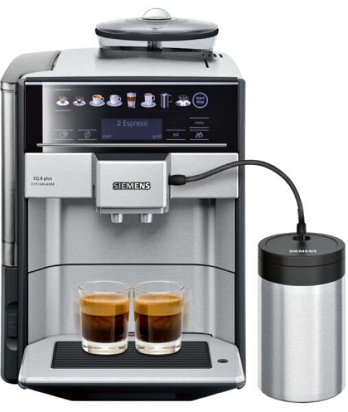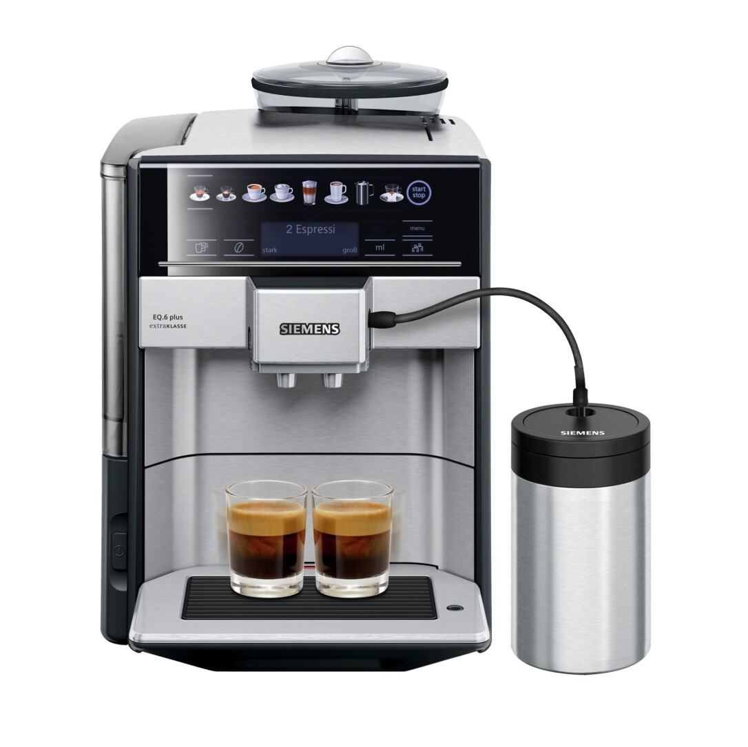 Siemens EQ.6 plus. Produkttyp: Espressomaschine, Kaffeezubereitungstyp: Vollautomatisch, Fassungsvermögen Wassertank: 1,7 l, Kaffee-Einfüllart: Kaffeebohnen, Gemahlener Kaffee, Behälter für gebrühten Kaffee: Tasse, Kapazität (in Tassen): 2 Tassen, Anzahl der Ausflüsse: 2, Eingebautes Mahlwerk. Display-Typ: LCD. Leistung: 1500 W. Produktfarbe: Schwarz, Edelstahl