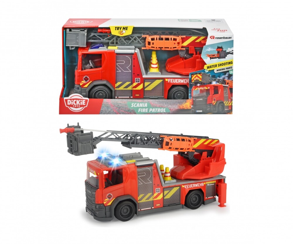 This Dickie Toys Scania fire engine features a turntable ladder and is the ideal toy for your little one to discover the world of emergency vehicles. The toy fire engine has rolling wheels and a water spray function. The water can be positioned accurately using the swivel-mounted turntable ladder. The turntable ladder can also be extended. Just like a real fire engine, the toy also comes with extendable legs to stabilize the vehicle. The lovingly designed vehicle combines a Scania cabin with a Rosenbauer-inspired exterior. Scania and Rosenbauer also inspired the design of the traffic cones and stretcher, as well as the opening side-panels. In addition to a detailed design, the toy vehicle features light and sound effects and comes with batteries.