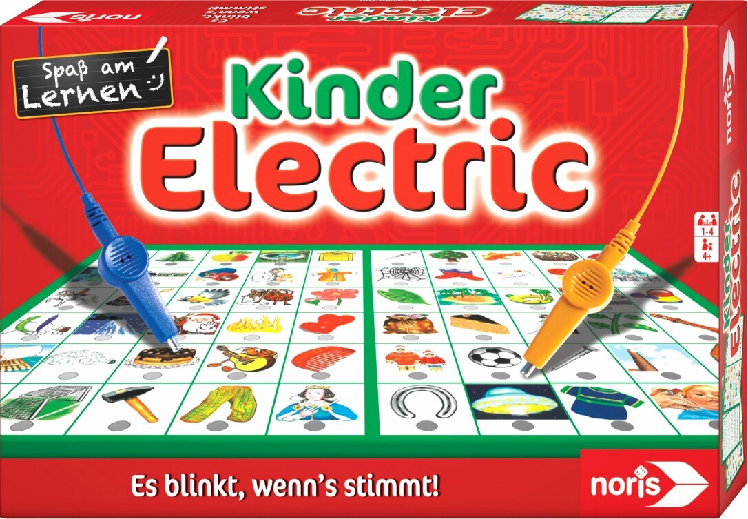 Es blinkt - wenn's stimmt! Eine der unterschiedlichen Aufgaben-Karten wird auf das Spielbrett-Modul gelegt. Unter jedem Bild befindet sich eine elektrische Kontaktfläche. Es geht darum, zu einem Bild der rechten Hälfte ein passendes Bild der linken Hälfte zu finden. Berührt man die Kontaktflächen dieser beiden Bilder mit den Steckern, dann leuchtet das Lämpchen auf. Gehören die Bilder nicht zusammen, dann leuchtet das Lämpchen nicht. Für 1 - 4 Spieler im Alter ab 4 Jahren. Sprachen: D