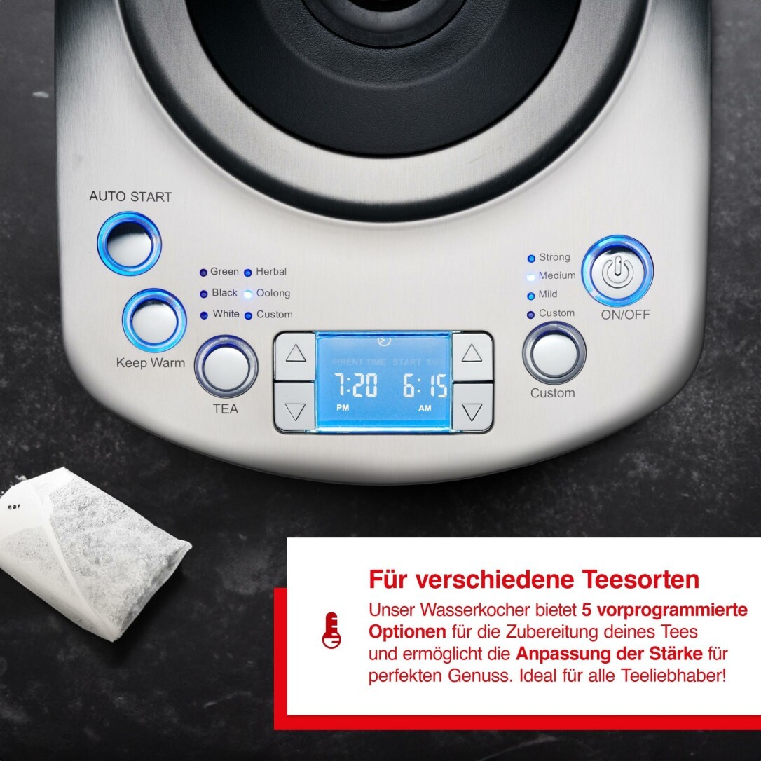 Der Teekocher ist vielseitig einstellbar. Die Stärke des Tees kannst du natürlich auswählen: Entscheide dich zwischen den Stufen stark, medium und mild. Außerdem kannst du einen Timer einstellen - je nach Wunsch startet der Teekocher automatisch in bis zu 24 Stunden. Du stehst auf oder kommst nach Hause und dein Tee ist genau im richtigen Moment fertig.